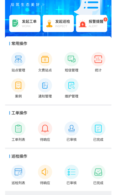 微信小程序主要為用戶提供各種線上服務(wù),涵蓋工單模塊、巡檢模塊、報(bào)警模塊、站點(diǎn)管理等功能。