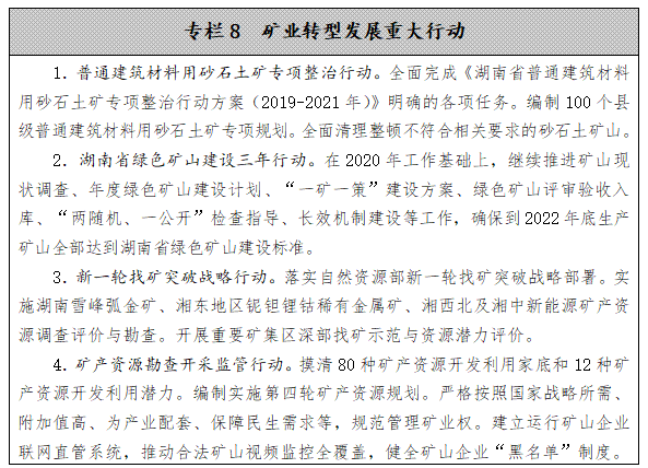 構建綠色礦山建設長效機制。健全政府引導、部門協(xié)作、企業(yè)主建、第三方評估、社會監(jiān)督的綠色礦山建設工作體系,優(yōu)化綠色礦山建設標準,完善配套激勵政策??偨Y和推廣礦業(yè)轉型發(fā)展改革試點經(jīng)驗,實施綠色礦山建設三年行動,生產(chǎn)礦山全部達到湖南省綠色礦山標準,基本形成環(huán)境友好、高效節(jié)約、管理科學、礦地和諧的礦山綠色發(fā)展新格局。推進郴州、花垣國家級綠色礦業(yè)發(fā)展示范區(qū)建設,充分發(fā)揮示范引領作用。推薦一批省級示范礦山入選國家級綠色礦山名錄。