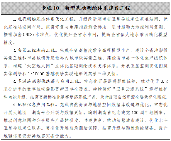 推進新型基礎測繪體系建設。在做好全省1:10000地形圖和市縣城鎮(zhèn)開發(fā)邊界內(nèi)1:500地形圖生產(chǎn)更新的基礎上,以“滿足要求、貼近需求”為導向,推進新型基礎測繪體系和實景三維湖南工程建設,建立以實景三維湖南為核心的新型基礎測繪產(chǎn)品體系,帶動生產(chǎn)組織體系、標準政策體系、技術支撐體系和應用服務體系的全面重構。按照“試點驗證、按需精化、以用促建、省市聯(lián)動”的思路,基本建成覆蓋全面、更新及時、管控精準、立體直觀、承載力強的實景三維湖南和省級統(tǒng)籌、聯(lián)動更新、開放共享、按需服務的湖南省新型基礎測繪體系。