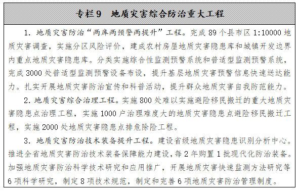 健全完善地質災害防治技術標準和制度體系。編制地質災害調(diào)查評價、監(jiān)測預警、工程治理、風險管控等技術要求和標準規(guī)范,形成符合我省實際的地質災害防治標準體系。健全地質災害危險性評估、農(nóng)民建房地質災害風險簡易評估等相關制度,形成完善的地質災害防治制度體系。